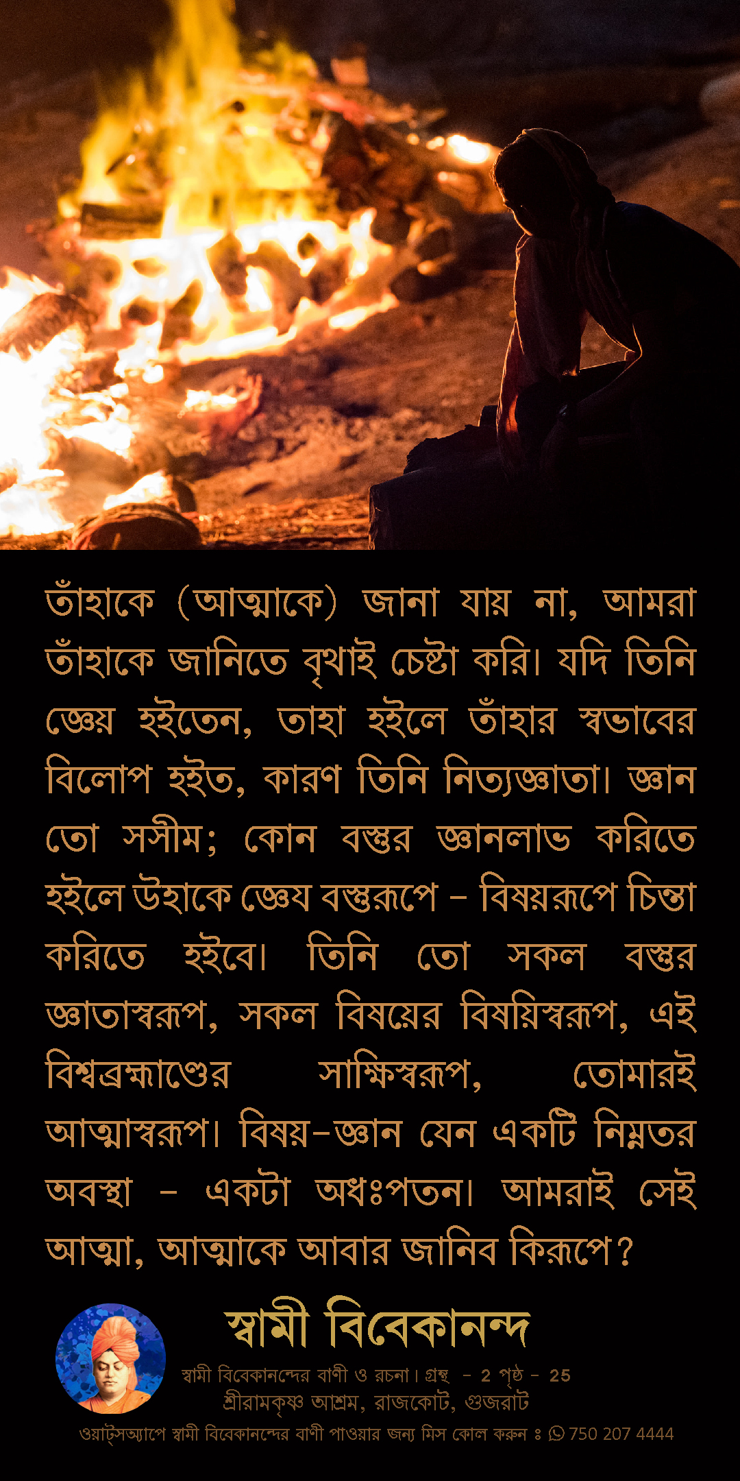 তাঁহাকে (আত্মাকে) জানা যায় না, আমরা তাঁহাকে জানিতে বৃথাই চেষ্টা করি। যদি তিনি জ্ঞেয় হইতেন, তাহা হইলে তাঁহার স্বভাবের বিলোপ হইত, কারণ তিনি নিত্যজ্ঞাতা। জ্ঞান তো সসীম; কোন বস্তুর জ্ঞানলাভ করিতে হইলে উহাকে জ্ঞেয বস্তুরূপে – বিষয়রূপে চিন্তা করিতে হইবে। তিনি তো সকল বস্তুর জ্ঞাতাস্বরূপ, সকল বিষয়ের বিষয়িস্বরূপ, এই বিশ্বব্রহ্মাণ্ডের সাক্ষিস্বরূপ, তোমারই আত্মাস্বরূপ। বিষয়-জ্ঞান যেন একটি নিম্নতর অবস্থা একটা অধঃপতন৷ আমরাই সেই আত্মা, আত্মাকে আবার জানিব কিরূপে ?