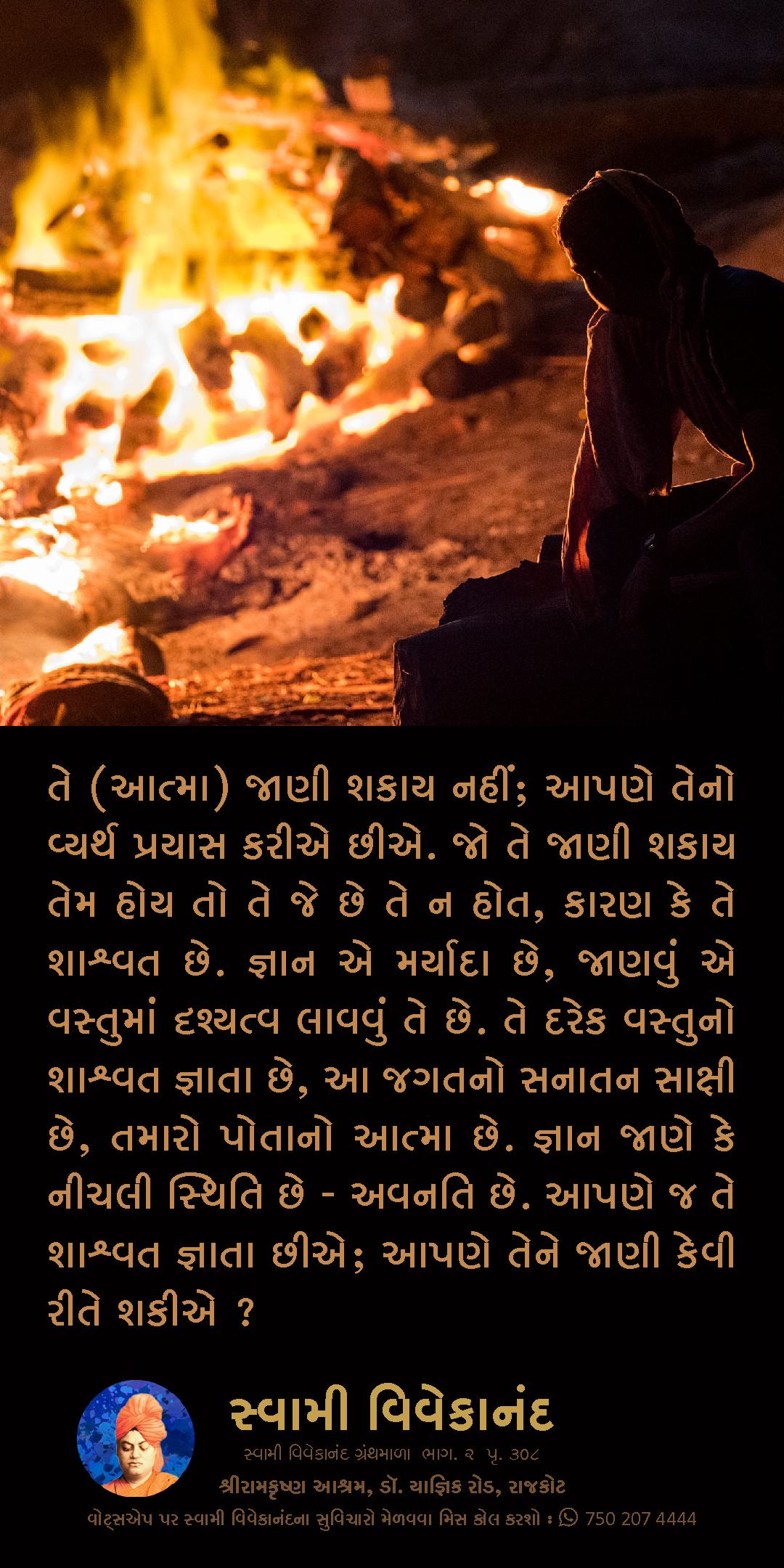તે (આત્મા) જાણી શકાય નહીં; આપણે તેનો વ્યર્થ પ્રયાસ કરીએ છીએ. જો તે જાણી શકાય તેમ હોય તો તે જે છે તે ન હોત, કારણ કે તે શાશ્વત છે. જ્ઞાન એ મર્યાદા છે, જાણવું એ વસ્તુમાં દૃશ્યત્વ લાવવું તે છે. તે દરેક વસ્તુનો શાશ્વત જ્ઞાતા છે, આ જગતનો સનાતન સાક્ષી છે, તમારો પોતાનો આત્મા છે. જ્ઞાન જાણે કે નીચલી સ્થિતિ છે – અવનતિ છે. આપણે જ તે શાશ્વત જ્ઞાતા છીએ; આપણે તેને જાણી કેવી રીતે શકીએ ? (સ્વામી વિવેકાનંદ ગ્રંથમાળા ભાગ ૨ પૃ. ૩૦૮)