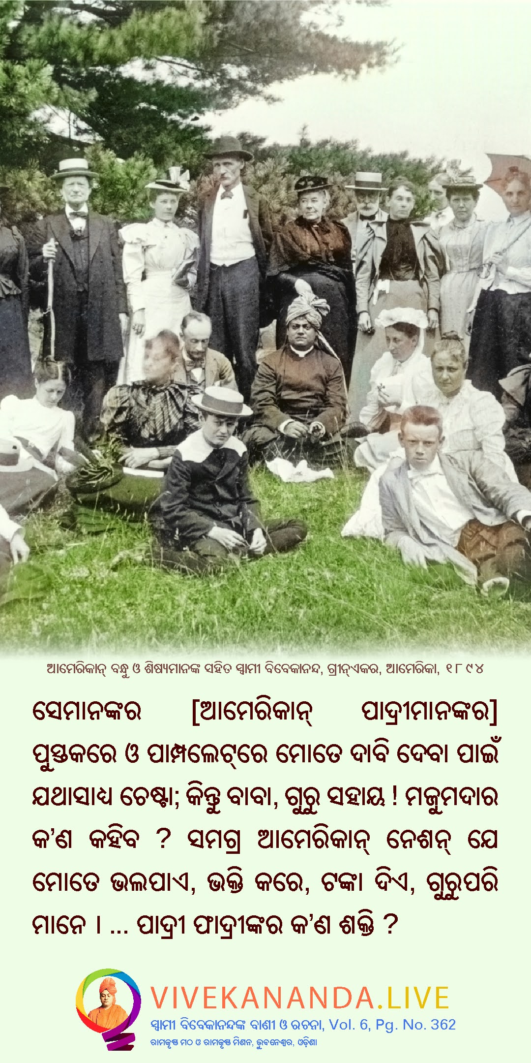 তাদের পুস্তকে প্যাম্ফলেটে যথাসাধ্য আমায় দাবাবার চেষ্টা; কিন্তু গুরু সহায় বাবা! মজুমদার কি বলে? সমস্ত আমেরিকান নেশন যে আমাকে ভালবাসে, ভক্তি করে, টাকা দেয়, গুরুর মত মানে— মজুমদার করবে কি? পাদ্রী-ফাদ্রীর কি কর্ম?